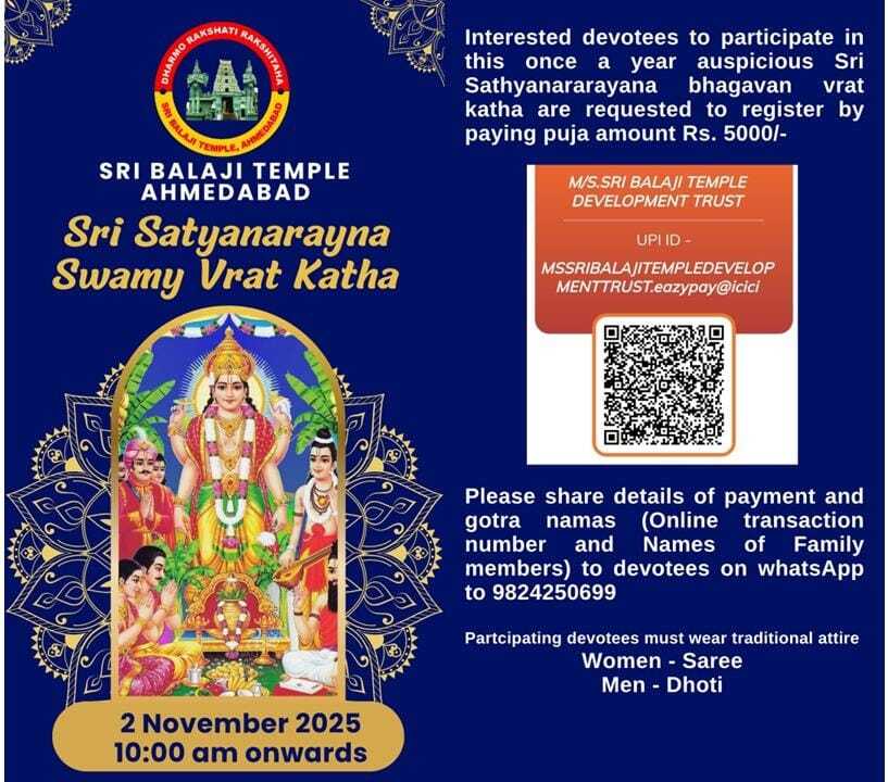 Sri Venkateswaraswamy temple was constructed by Ahmedabad Andhra MahaSabha to provide and show the devotees of Lord Sri Balaji residing in and around Gujarat, the sevas and pujas being performed in Lord’s abode of Tirumala. The land for the temple was acquired in 2000 and Bhoomipuja for construction of temple held in 2003. The temple was opened for the public after Pranapratishta on 7th April 2007. For day to day activities and running of the temple in smooth manner, an independent trust was formed in the name of “ Sri Balaji Temple Development Trust” is in 2012. …