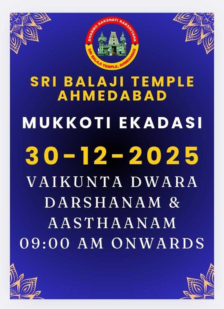 - Sri Balaji Temple!!!.A long cherished dream of Telugu people residing in Ahmedabad came true on 7Th April 2007 under Ahmedabad Andhra Maha Sabha. The land for the temple was acquired in the year 2000 and Bhoomi puja for construction of temple was held by the then chief minister of Gujarat Sri Narendra Modi in 2003. The temple designs were drawn as per Vykhanasa Aagama Sastra with the help of TirumalaTirupatiDevasthanams (TTD) Tirupati.Read More…
