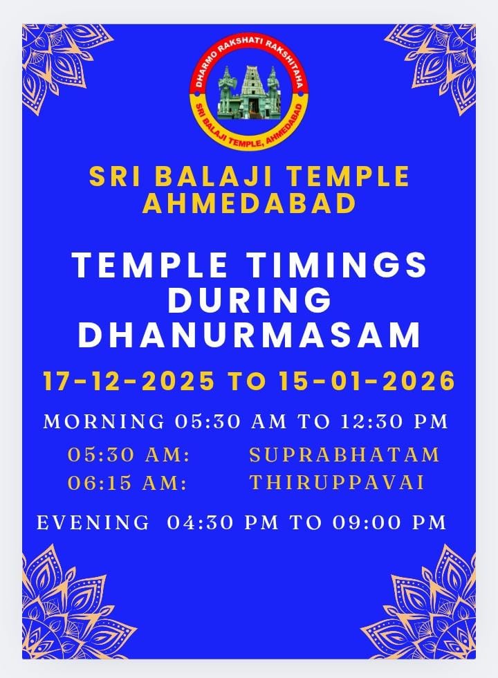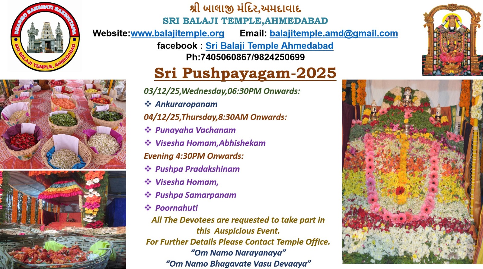 - Sri Balaji Temple!!!.A long cherished dream of Telugu people residing in Ahmedabad came true on 7Th April 2007 under Ahmedabad Andhra Maha Sabha. The land for the temple was acquired in the year 2000 and Bhoomi puja for construction of temple was held by the then chief minister of Gujarat Sri Narendra Modi in 2003. The temple designs were drawn as per Vykhanasa Aagama Sastra with the help of TirumalaTirupatiDevasthanams (TTD) Tirupati.Read More…